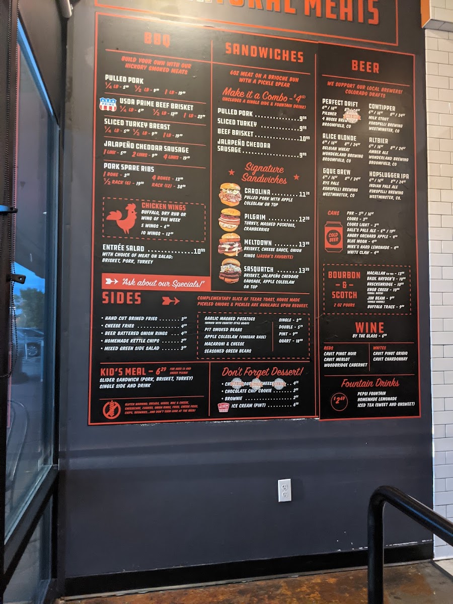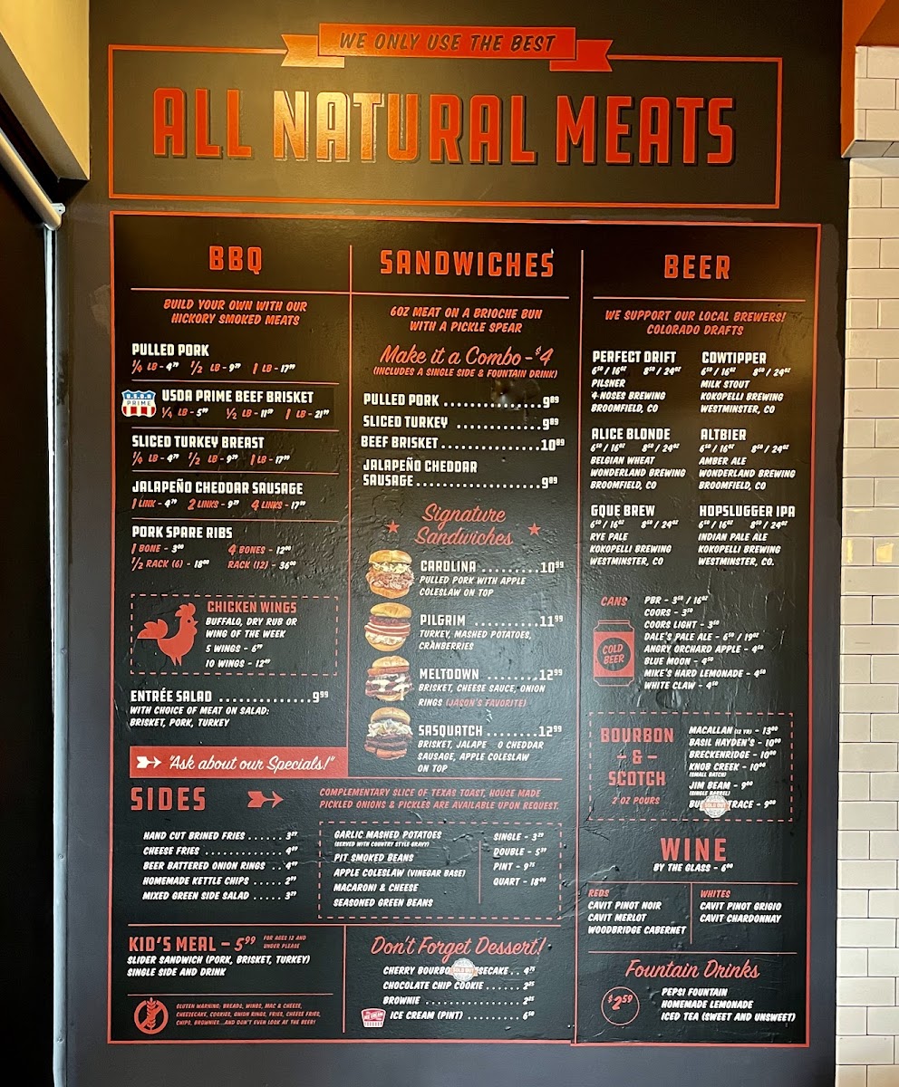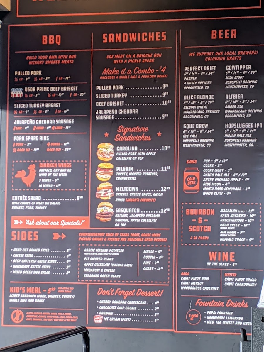 Expect dishes like tender pulled pork, smoky ribs, and savory brisket alongside comforting sides such as garlic mashed potatoes, mac and cheese, and pit-smoked beans. The menu extends to include flavorful chicken wings and specialty sandwiches, making it easy to find something that suits different tastes and cravings throughout the day.